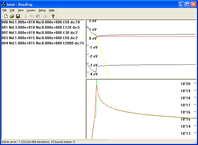 The program will solve Poisson's and Schrodinger's equations. You can interactively edit the layer stack and view the band diagram on the right side. Polarization is calculated in GaN/AlGaN systems. Currently, there is very limited graphics support, and concentrations are calculated using the Boltzmann approximation - you have been warned (Update 7/5/03 now uses a modified Sommerfeld approximation for degenerate areas.) Also, many menu options simply do not work under the materials database. Feel free to update your database though, because future versions will use those data fields. Also note that the status bar gives kind of bogus information right now. The iterations are right, and that's about it. It's all a work in progress of course...